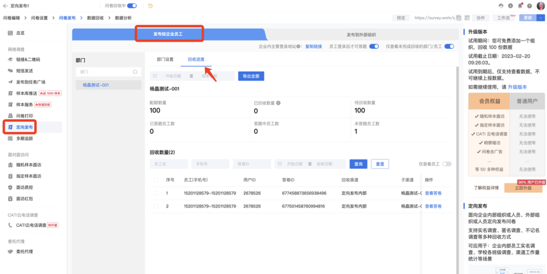 (回收进度查询及导出数据界面)目前,问卷定向发布服务针对个人版本无法使用,需要升级到企业版本。对此,调研工厂推出了“免费试用7天”福利活动,如果有个性化调研需求快来试用吧!试用路径:登录调研工厂(https://survey.work)后台>升级至企业版>问卷发布>定向发布。