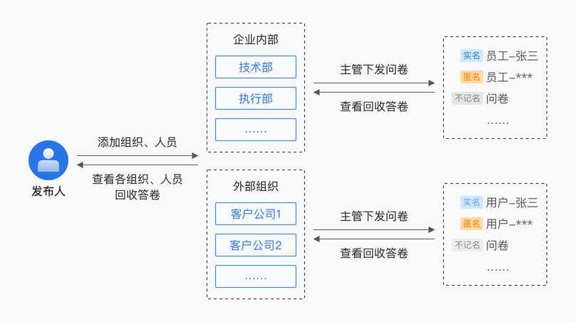 各组织主管通过问卷定向发布服务,负责面向企业内部组织或人员、或外部组织定向发布问卷。各组织主管登录指定的系统,获取本组织答题链接,分发答题链接,回收数据。